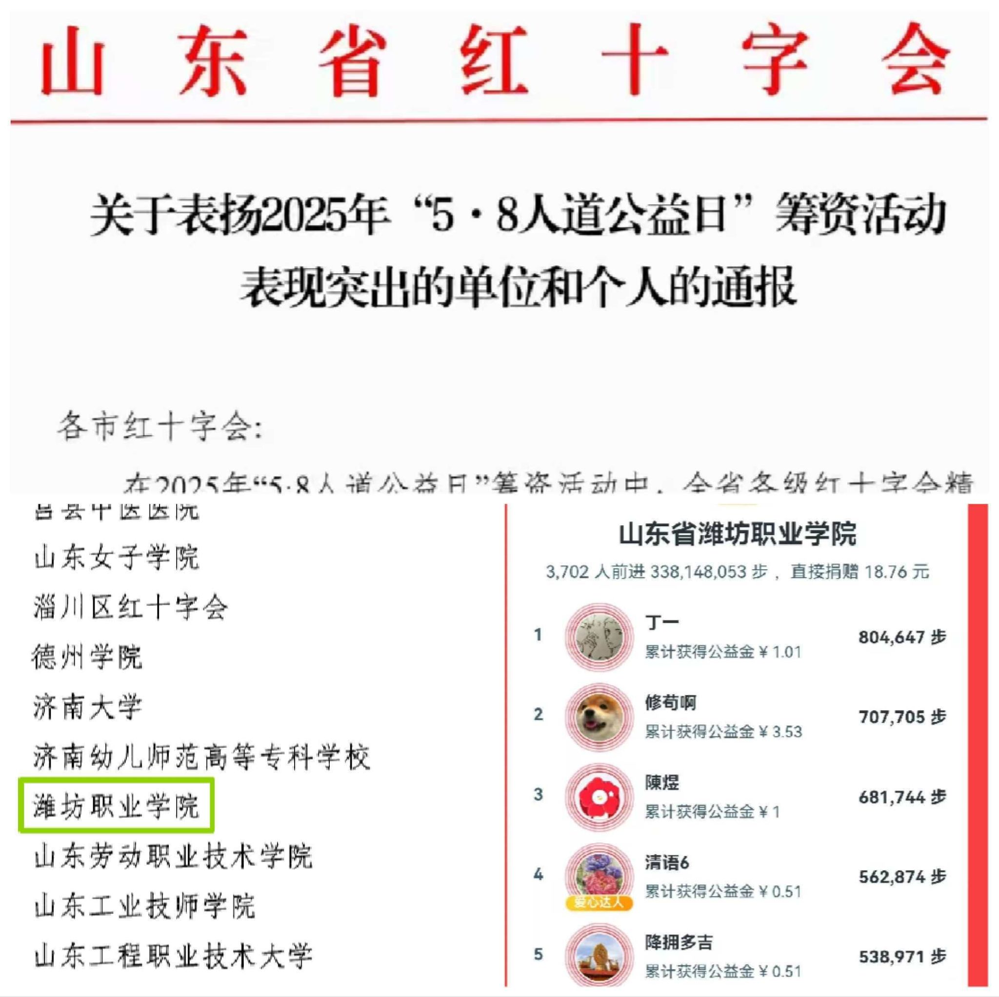 近日,山东省红十字会发布《关于表扬2025年“5·8人道公益日”筹资活动表现突出的单位和个人的通报》,我院被选为2025年“一块走”捐步活动表现突出单位。在2025年“5·8人道公益日”筹资活动中,我院积极响应潍坊市和山东省红十字会有关要求,大力弘扬“人道、博爱、奉献”的红十字精神,组建开云手机平台“一块走”小队,组织发动广大师生参与“一块走”捐步公益活动。开云(中国)3702名师生积极行动,前进3.38亿步,捐步排名进入全国百强(...更多 -