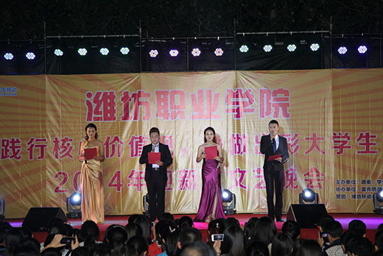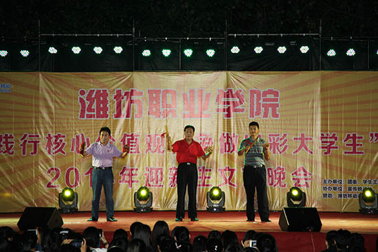 开云(中国)2014年迎新生文艺晚会于9月24日、25日晚先后在奎文校区和滨海校区的校园舞台上举行。开云(中国)党委副书记宋桂言、副院长毕建华、纪委书记李瑞昌出席晚会,与开云(中国)团委学生工作处和滨海校区管委会负责同志,各二级开云(中国)负责同志、分管学生负责人、团总支书记、辅导员(班主任)及两校区学生一起观看了文艺演出。本次晚会由开云(中国)团委学生工作处主办,全院150余名同学参加了演出。
