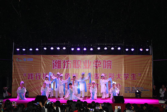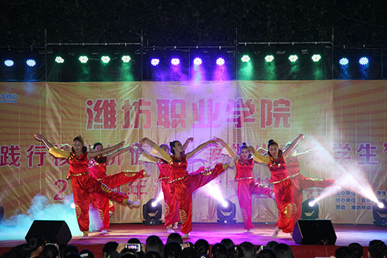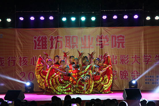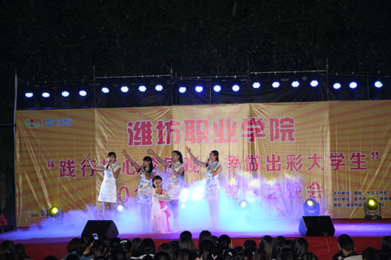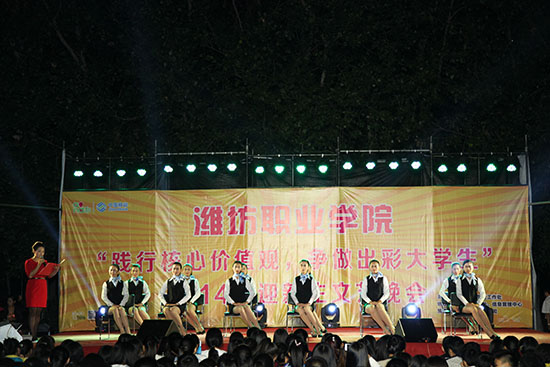 活力四射的舞蹈《让我们舞起来》拉开了本场晚会的序幕,美轮美奂的舞台效果立刻将全场的气氛调动了起来。接下来,“3+2”本科班学生带来的《奔跑》、《倔强》等充满激情的歌曲感染了全场的观众,教师代表演唱的《儿行千里母担忧》和学生代表演唱的《天亮了》抒发出了父母对孩子的爱,精彩的《礼仪展示》引导新一代的大学生要自觉加强道德修养、讲礼貌、懂礼仪,街舞《Toxic dance》、印度舞《唯舞独尊》、拉丁舞《你是我的索尼娅》、吉他弹唱等引得在场同学们的阵阵欢呼,师生联合带来的《难忘滨海校区大决战》快板表演向大一新同学描述了滨海校区的美,激情洋溢的诗朗诵《明天,属于中国》诠释了潍职学子对伟大祖国的深情赞美和祝福,爆笑小品《如此选秀》轻松幽默的语言、搞笑夸张的动作让观众们捧腹大笑,《武动中华》、《水袖舞》、《春江花月夜》和民族舞《盛世欢腾》传统文化节目的表演博得一阵又一阵热烈的掌声。最后,晚会在男女二重唱《美丽中国梦》声中圆满落下帷幕。