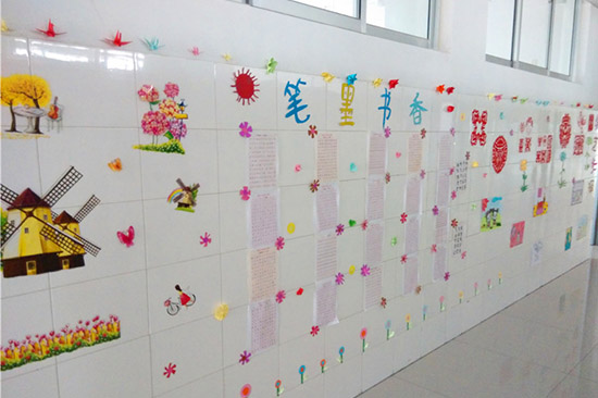 学生们用自己智慧的头脑和灵巧的双手打造了一面面主题突出、色彩鲜明、富有特色的文化墙。每班选取的素材,都是本班级的优秀作品,从手抄报到手绘画,从剪纸到手工制作,从书法到日常生活照片,这些素材的选取和制作都是学生独特构思和精心设计的。