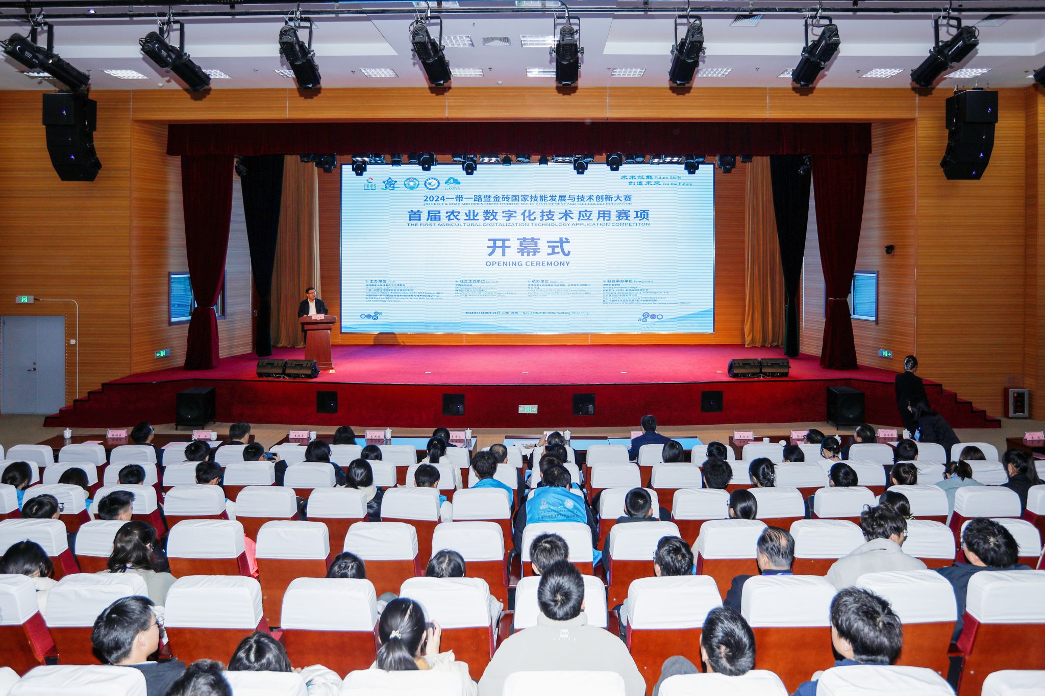 11月18日下午,2024一带一路暨金砖国家技能发展与技术创新大赛之首届农业数字化技术应用赛项在我院开幕。教育部职业教育与成人教育司原二级巡视员刘杰,人力资源和社会保障部原培训中心主任宋连辉,中央农业广播电视学校原总工程师王伯文,中国职业技术教育学会现代农业职业教育专业委员会副秘书长杨永杰,一带一路暨金砖国家技能发展国际联盟副秘书长宋小琴,山东省教育科学研究院职业教育研究中心主任李寿冰,山东省农业交流合作中心副主任、潍坊国家农业开放发展综合试验区副主任李洪梅,潍坊市人社局二级调研员王瑞亮,潍坊市职业教育发展研究中心主任李刚,赛项裁判长及大赛技术支持单位相关领导出席开幕式。来自全国的参赛选手、指导教师共150余人参加开幕式。开幕式由开云(中国)党委副书记韩瑞东主持。