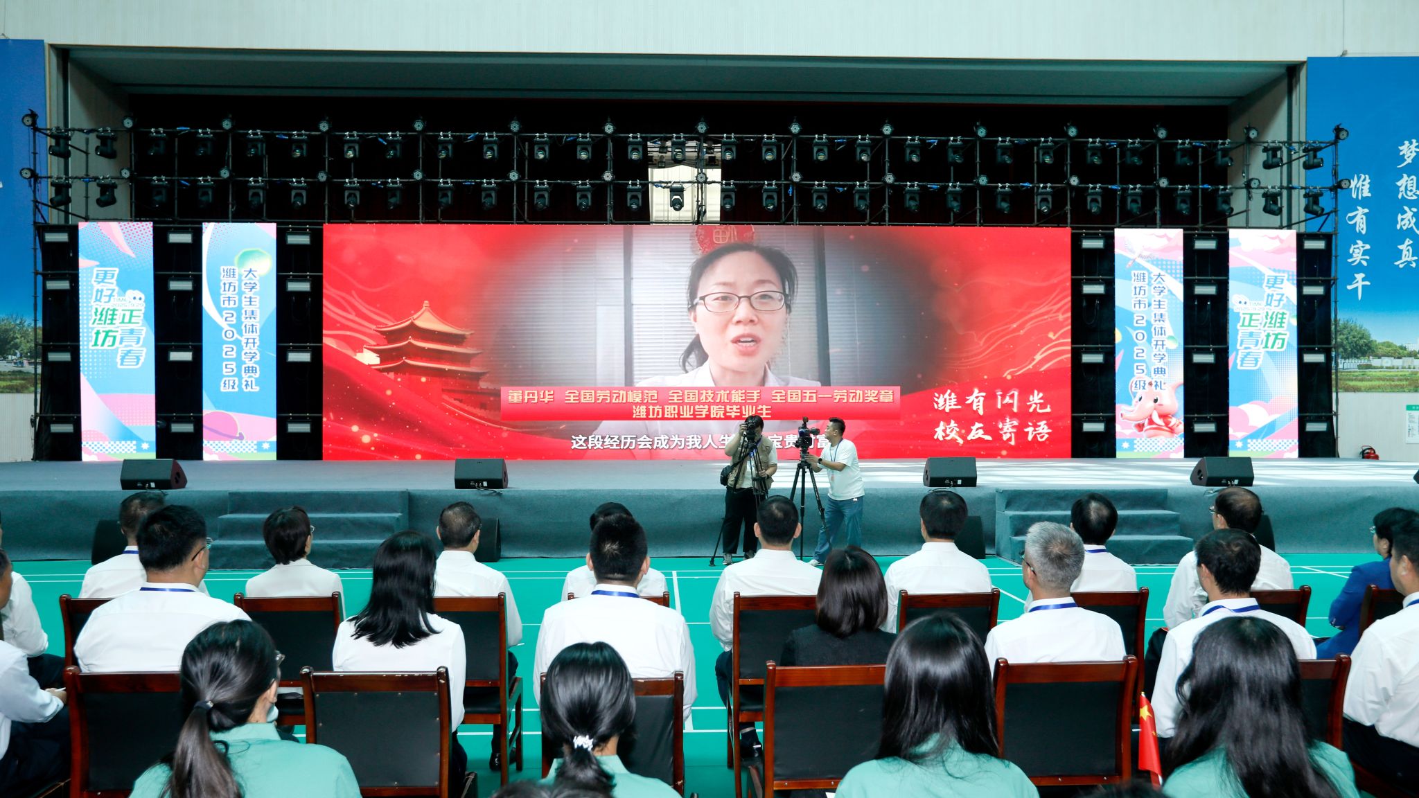 在“校友寄语《潍有闪光》”环节,我院杰出校友、全国劳动模范、全国技术能手、中国白酒首席品酒师董丹华深情分享成长经历。她从一名普通技术人员成长为正高级工程师、国家级白酒评委,带领团队斩获布鲁塞尔国际烈性酒大奖赛金奖,用20余年坚守诠释了“技能报国”的工匠精神。她寄语新生:“青春不是等待被定义,而是主动去创造。只要心怀热爱、脚踏实地,就一定能在属于自己的舞台上‘闪出光来’。”真挚的话语引发强烈共鸣,激励学子立足专业、锤炼本领,将个人成长融入城市发展。