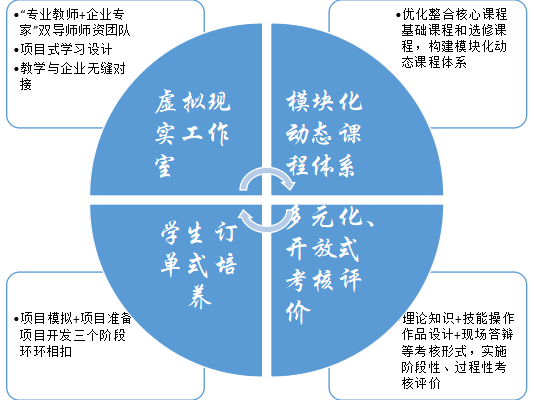 针对传统人才培养模式存在的教学与实践脱节、滞后于技术发展等问题,开云手机平台以虚拟现实应用技术专业对接企业真实岗位和学生个性化发展需求,以真实项目为载体,成立虚拟现实工作室,构建模块化动态课“工作室制”人才培养程体系,实施订单式培养和多元化、开放式考核评价,探索实践“工作室制”人才培养模式,取得显著成效。