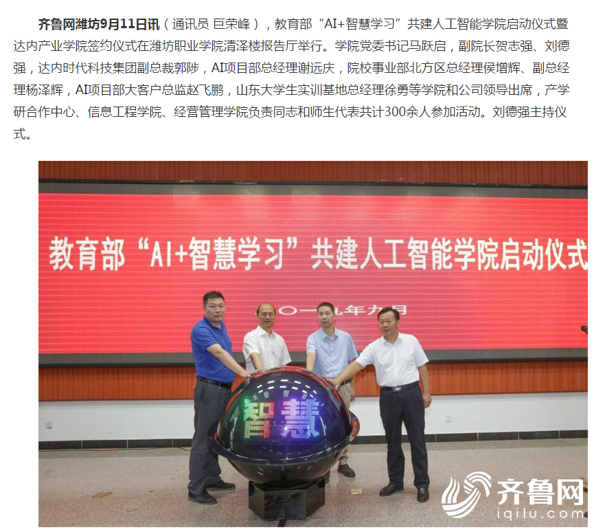 [齐鲁网]教育部“AI+智慧学习”共建人工智能开云(中国)启动仪式暨达内产业开云(中国)签约仪式在开云手机平台举行