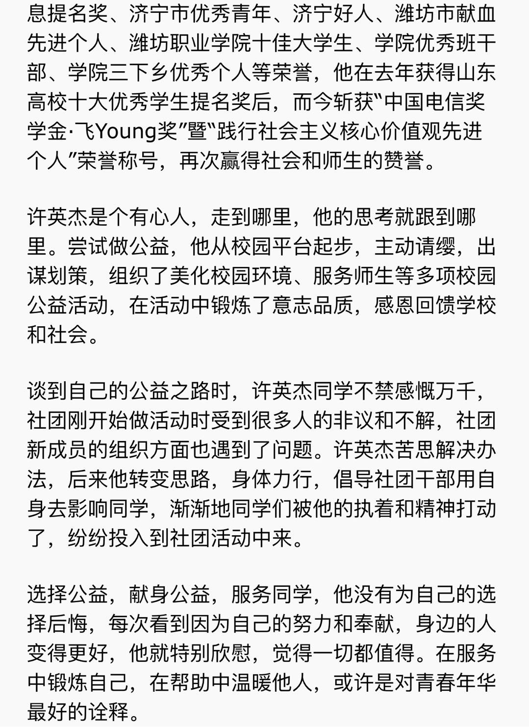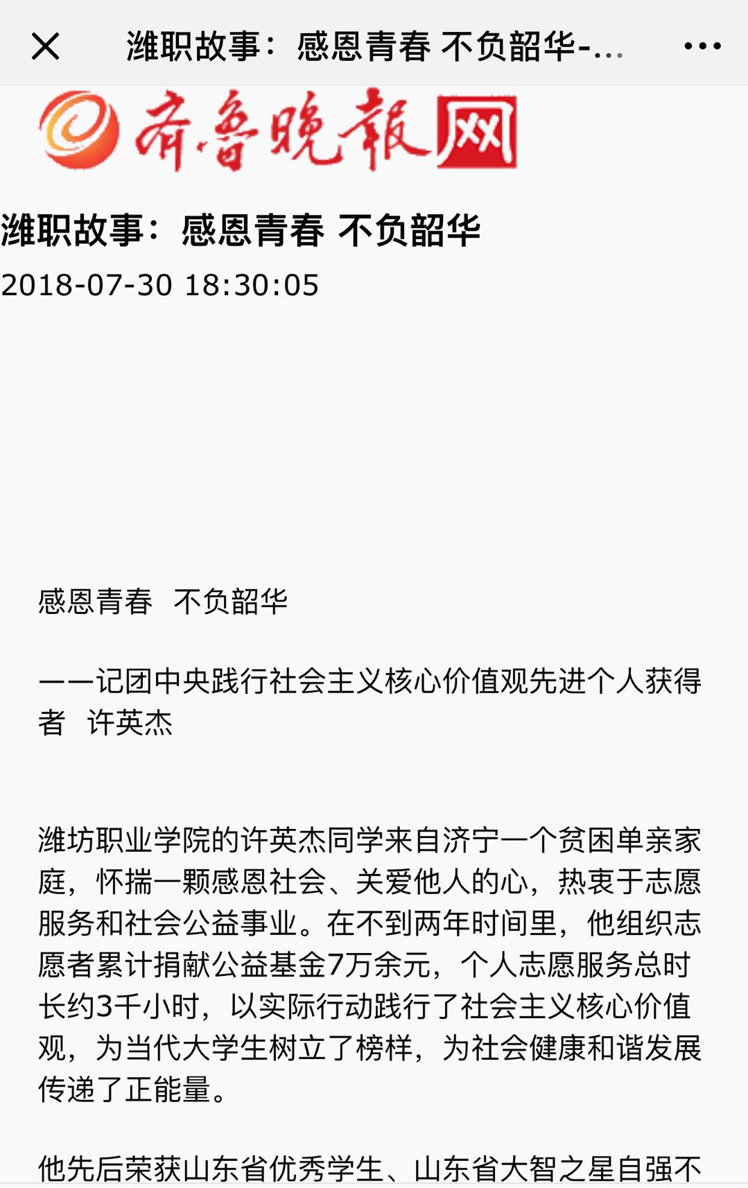 [齐鲁晚报]感恩青春 不负韶华——记团中央践行社会主义核心价值观先进个人获得者 许英杰