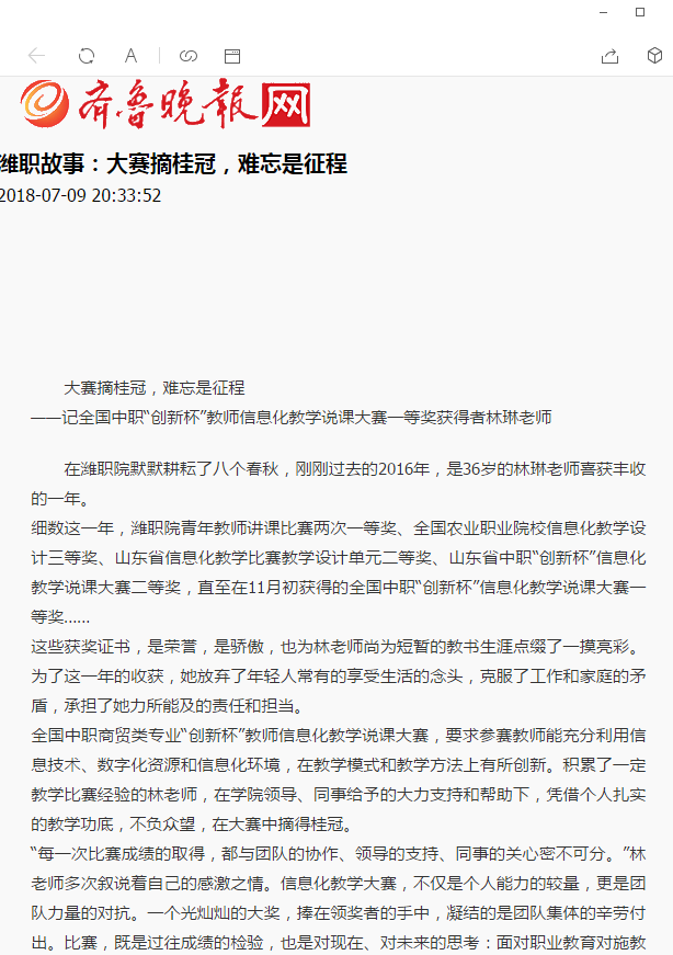 [齐鲁晚报]大赛夺冠,难忘是征程——记全国中职“创新杯”教师信息化教学说课大赛一等奖获得者林琳老师