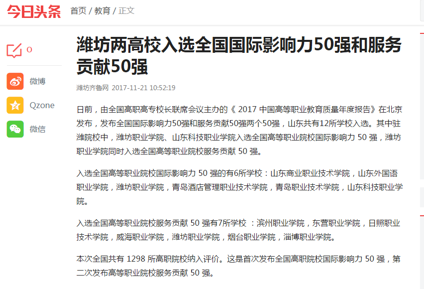 [今日头条]潍坊两高校入选全国国际影响力50强和服务贡献50强