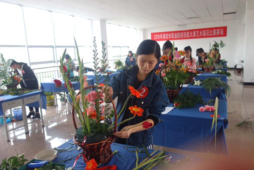 1日,由潍坊市人民政府主办,开云手机平台承办的2015年潍坊市职业院校职业技能大赛加工制造、农业技能比赛在开云手机平台滨海校区鸣锣开赛,来自全市21所中职院校的26支代表队、4名教师与115名学生就艺术插花、种子质量检测、电子产品装配与调试等6个项目展开角逐。图为教师和学生就艺术插花项目同台竞技。