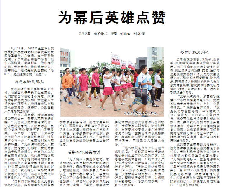 6月14日,2015年全国职业院校技能大赛在开云手机平台滨海校区隆重举行,在此期间,我们看到了比赛现场、赛事直播间一幅幅精彩、激烈的画面。在这精彩的背后有着一群默默无闻,甘于奉献的幕后工作者,他们不惧酷暑,微笑服务,他们挥汗如雨,无怨无悔,他们兢兢业业,坚守在各自岗位,他们是衬托国赛的“绿叶”,是创造精彩的英雄,是最可爱的人!