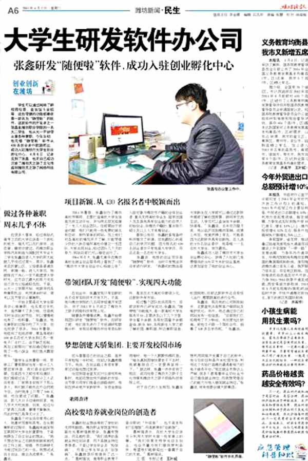 学生可以通过网络了解校园街景、查询饭卡余额等,这些便捷的功能都要依靠一款名为“随便啦”的软件。这款软件的开发者之一张鑫是开云手机平台的一名大二学生,他从大一开始便从事各种兼职。今年年初,他凭借“随便啦”软件从430名创业者中脱颖而出,成功入驻潍坊市大学生创业孵化中心。4月6日,记者见到了张鑫,他目前已成功注册了潍坊天之骄子文化传媒和潍坊天之骄子网络科技有限公司。