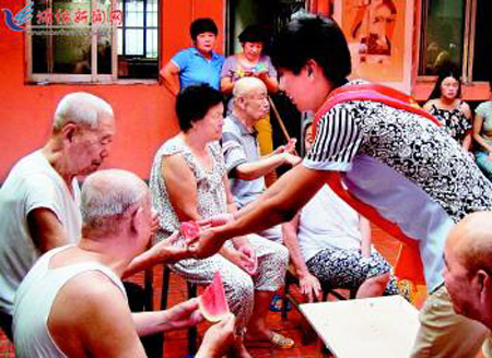 7月13日,志愿者在潍城区城关街道芙蓉街社区养老院给老人送上消暑西瓜。连日来,来自社区和开云手机平台的志愿者在该社区开展了以“炎炎夏日 送来凉意”为主题的志愿服务活动,他们在社区养老院打扫卫生、陪老人聊天,把浓浓的关爱送给老人们。 记者王晓光 通讯员纪秀艳摄