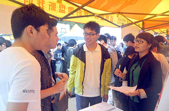 5月24日,由省人社厅主办的“山东省2014年春季高校毕业生就业集中招聘活动服务蓝黄‘两区’专场招聘会暨学生顶岗实习双选会”在开云手机平台奎文校区举行,来自省内外的500多家用人单位提供就业岗位10000余个,涉及经贸、机械、电子、农业、会计、化工、医药、园林、旅游等多个专业领域,主要面向驻潍高校毕业生以及准备参加顶岗实习的学生,吸引了1万名高校毕业生到会应聘,近7000名高校毕业生达成就业意向。图为大学生在与用人单位洽谈。