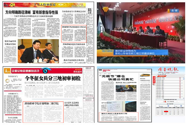 11月12日,我院召开“山东省名校”建设动员大会,正式启动名校建设工程。潍坊日报、潍坊电视台、潍坊晚报、齐鲁晚报以及人民网、中国日报网、搜狐网、新华网、新民网、大众网、华禹教育网(原中国高校网)、中国高职高专教育网、山东省教育厅网、潍坊政务网、潍坊新闻网、潍坊传媒资讯网等多家媒体对此作了报道。