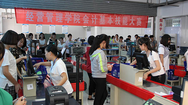 在奎文校区会计分岗实训室举行了2014年点钞和收银机操作技能展示大赛,2013级中职8个会计班共40名同学参加了比赛。点钞比赛包括多指多张点钞和扇面点钞,收银机操作包括商品扫码和录入商品条码。经过激烈的角逐,最终李青、王晓玥同学获点钞比赛一等奖,韩燕珍、董聪聪同学获收银机操作一等奖。