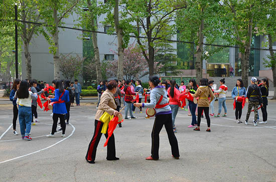 张老师的到来受到了社团60多名同学的热烈欢迎。在张老师的讲解指导下,同学们对腰鼓有了一定的认知,了解到腰鼓的重点在“打”上。张老师亲身示范了一套腰鼓舞,让同学们大开眼界,深受鼓舞。在张老师的悉心指点下,经过一下午的练习,同学们能简单地打击一些节奏,会走简单的秧歌十字步,能将手上的鼓点和脚上的步子基本协调起来,能够打出一套完整的腰鼓舞。