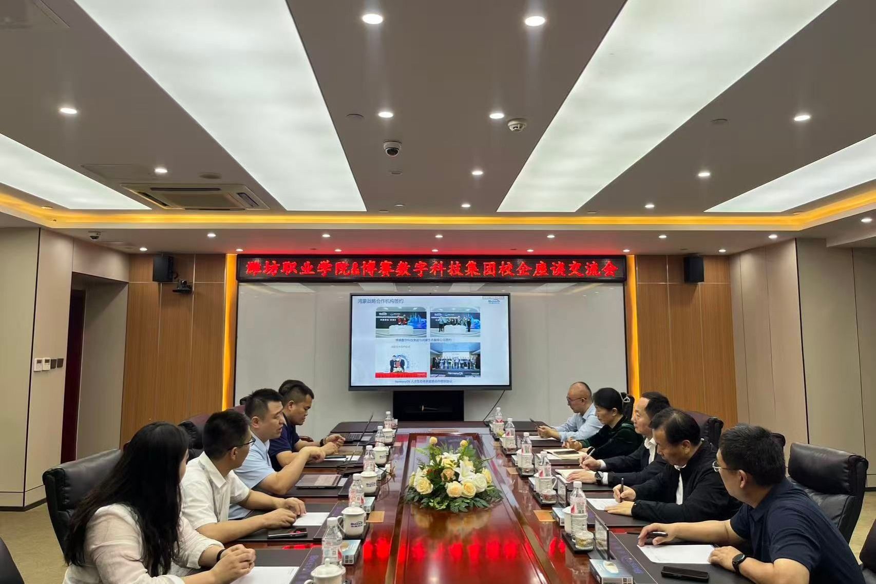 在博赛数字科技集团有限公司,董事长董良回顾了双方合作历程以及取得的育人成效,介绍了集团的发展历程、多元业态布局及未来发展规划,期待与我院加强校企合作,聚焦华为鸿蒙、数据标注等信息产业人才培养,推动产学研协同创新。