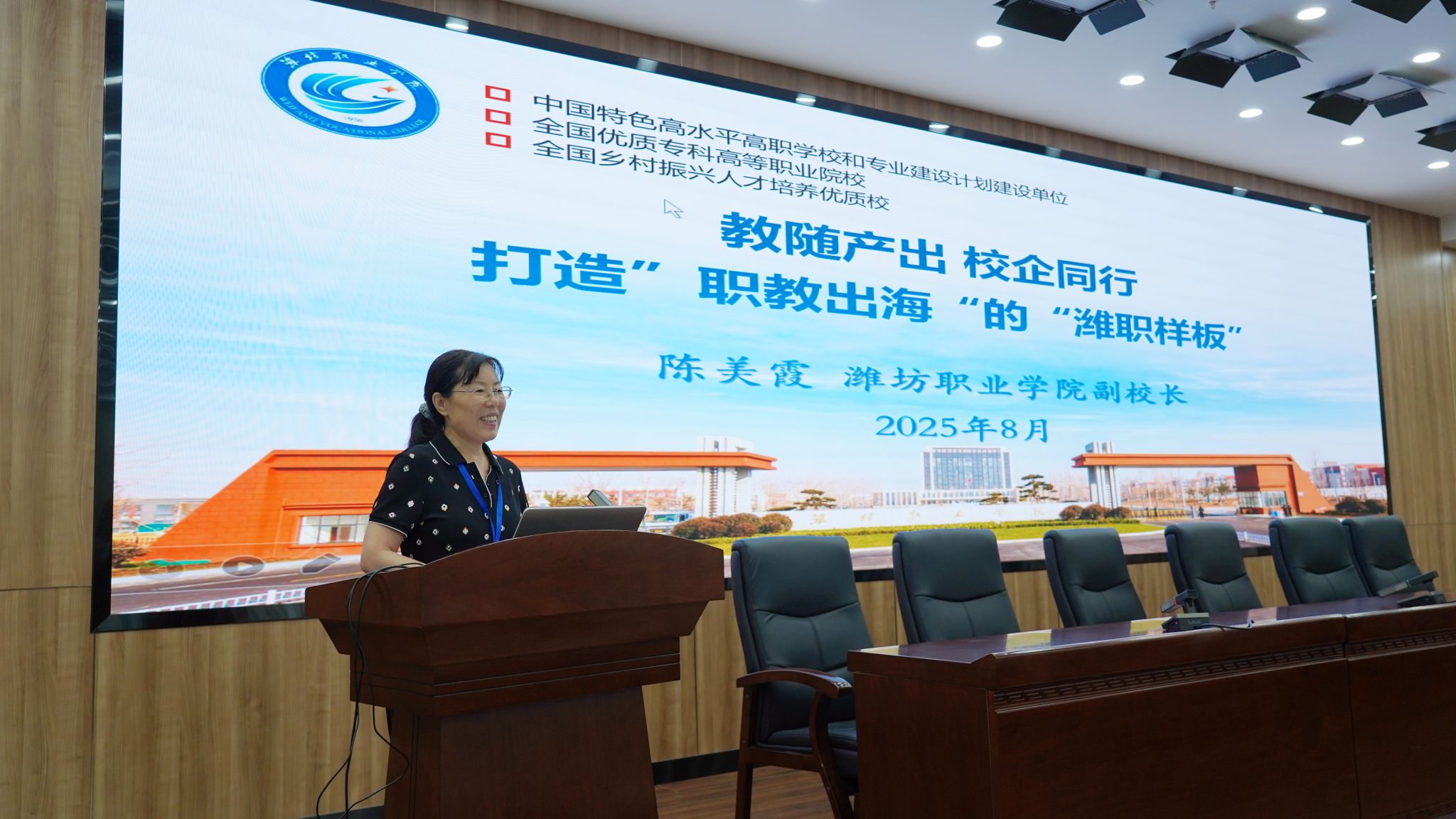 会上,陈美霞向参会院校和企业代表作了题为《教随产出 校企同行 打造“职教出海”的“潍职样板”》专题发言,介绍了我院的办学情况,以“教随产出 校企同行”为切入点,强调以产业需求为导向,强化校企深度合作,全力推进服务企业“走出去”、职业教育“走出去”。发言围绕依托援外项目,“借船出海”扬优势、服务企业“走出去”,“同船出海”扎根基、服务“一带一路”共建,“造船出海”树品牌三个方面分享了我院“职教出海”的主要做法及取得成效,并提出了面临的挑战与建议。