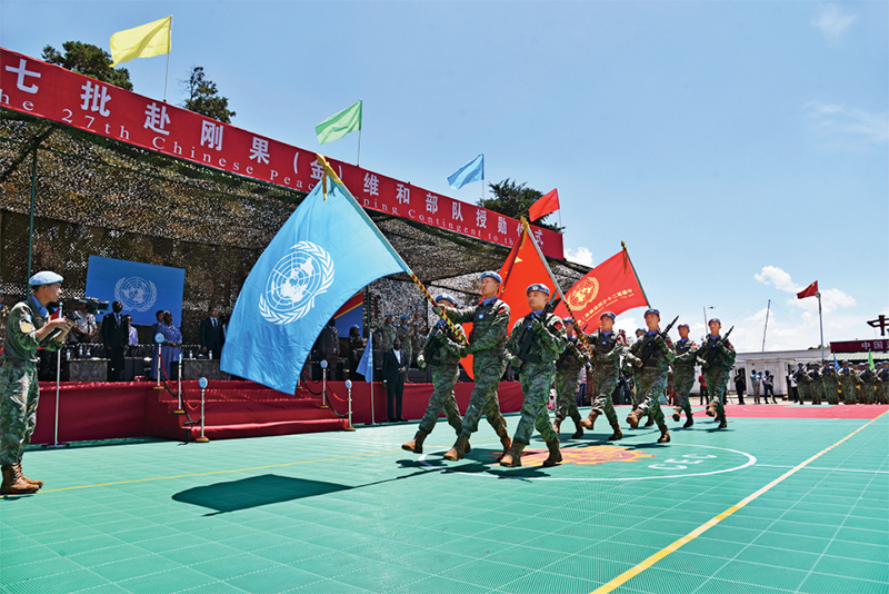 中国是维护世界和平的中流砥柱,是联合国第二大会费国、联合国第二大维和摊款国和安理会常任理事国中第一大维和行动出兵国。图为2024年4月9日,在刚果(金)南基伍省布卡武市的中国半岛营区,中国第27批赴刚果(金)维和部队官兵被授予联合国“和平勋章”并参加授勋仪式。