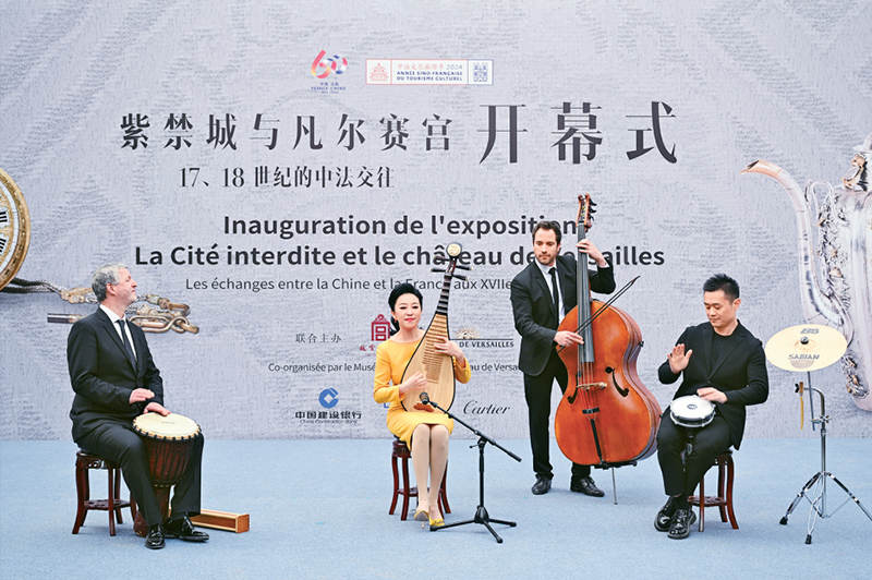 全球文明倡议提出1年多来,中国积极致力于推动各国相互理解、相互尊重、相互信任,促进文明交流互鉴,丰富世界文明百花园。图为2024年4月1日,在北京故宫博物院举行的“紫禁城与凡尔赛宫——17、18世纪的中法交往”展览开幕式上,中法艺术家合奏。