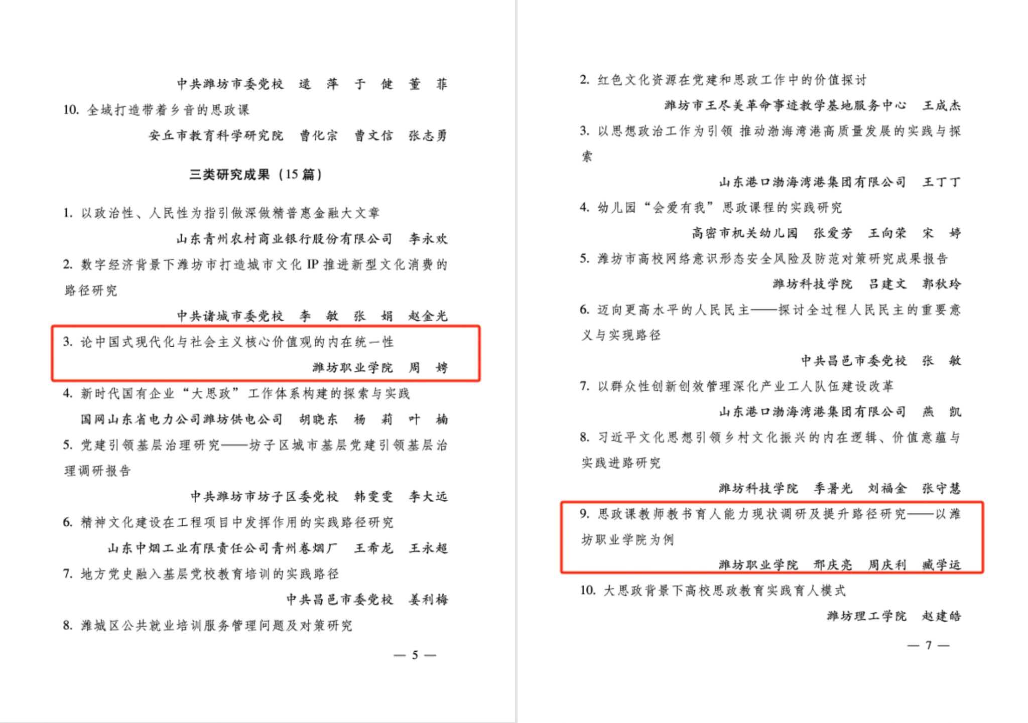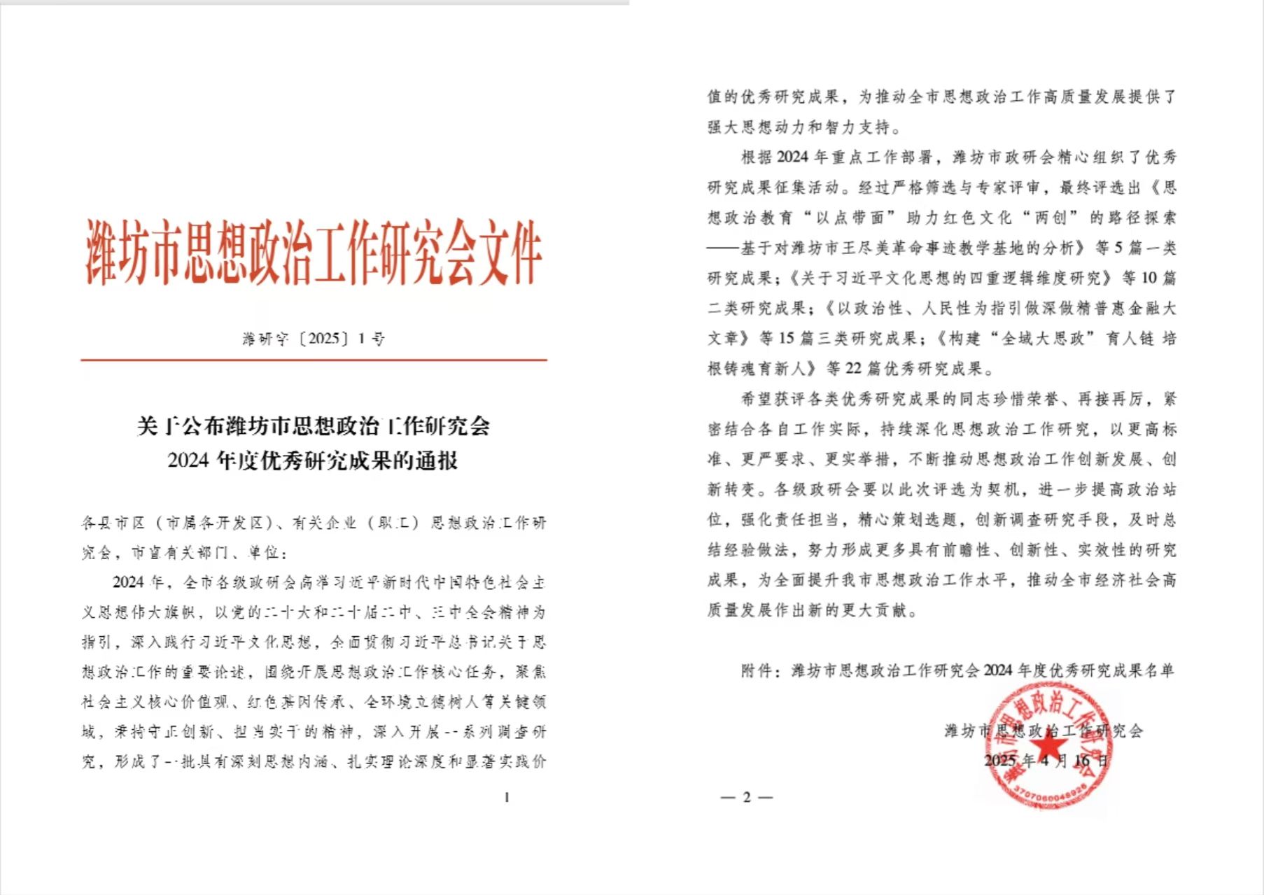 近日,潍坊市思想政治工作研究会公布了2024年度优秀研究成果评选结果,我院马克思主义开云(中国)申报的2项成果获奖。
