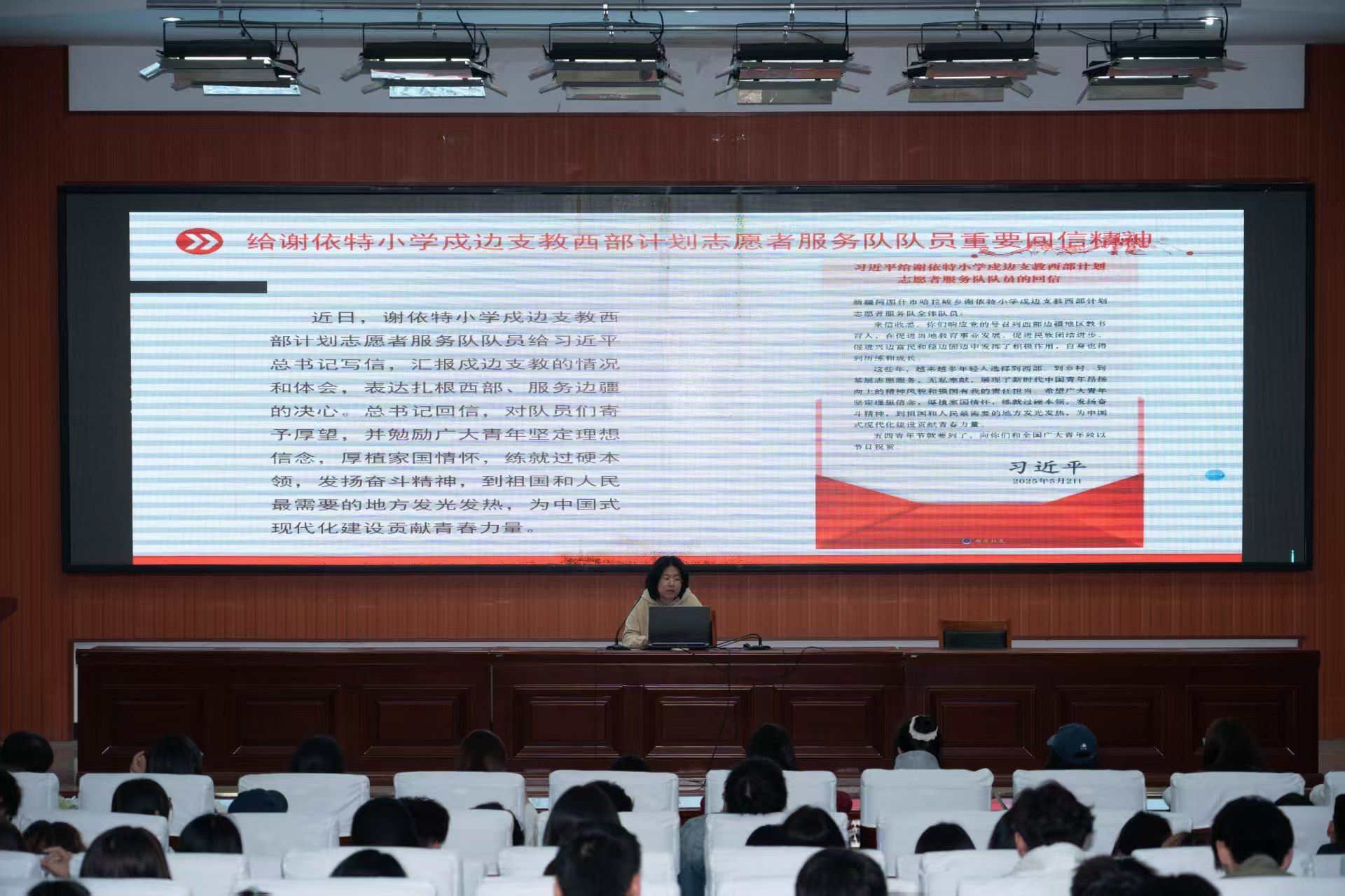 5月6日,开云(中国)在清泽楼报告厅组织专题学习,学习贯彻习近平总书记重要讲话《激励新时代青年在中国式现代化建设中挺膺担当》和给谢依特小学戍边支教西部计划志愿者服务队队员回信精神,校学生会全体成员、第十一期“青马班”全体学员参加学习。